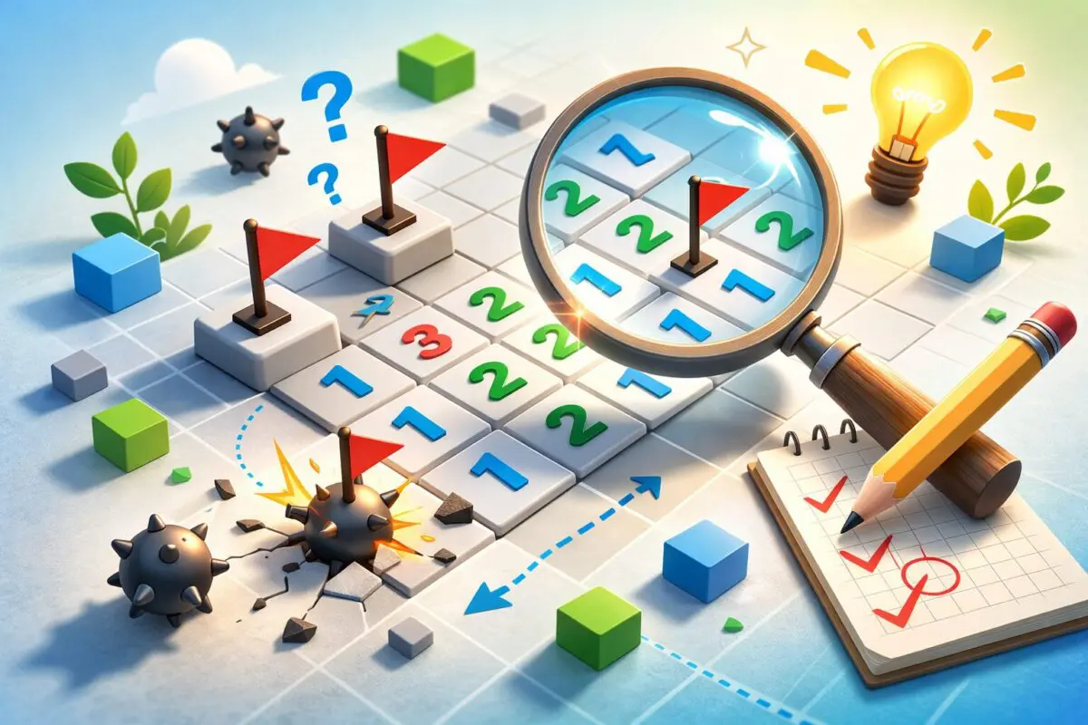 クリア率を上げるコツは、①確実に地雷があるマスは迷わず旗、②数字の周りに必要数の旗がそろったら残りは安全なので一気に開く、③角や端からヒントを増やす、の3つ。たとえば「角に出た1」の周囲に未開封が1マスしかないなら、そこはほぼ確定で地雷。こうした“確実に分かる場面”を積み重ねるだけで、無駄なミスが激減します。さらに「1-2-1」「1-2-2-1」などの確定パターンを覚えると、推理スピードが一段上がり、モヤモヤしがちな中盤の停滞も突破しやすくなります。
