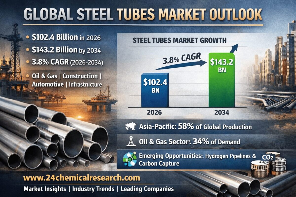 グローバル鋼管市場は堅調な成長を示しており、2026年には1,024億米ドルと評価され、予測期間全体で年平均成長率(CAGR)3.8%で推移し、2034年には1,432億米ドルに拡大する見込みです。この持続的な需要は、インフラ開発、エネルギー分野の要件、そして鋼管の耐久性と費用対効果に依存する産業用途に起因しています。